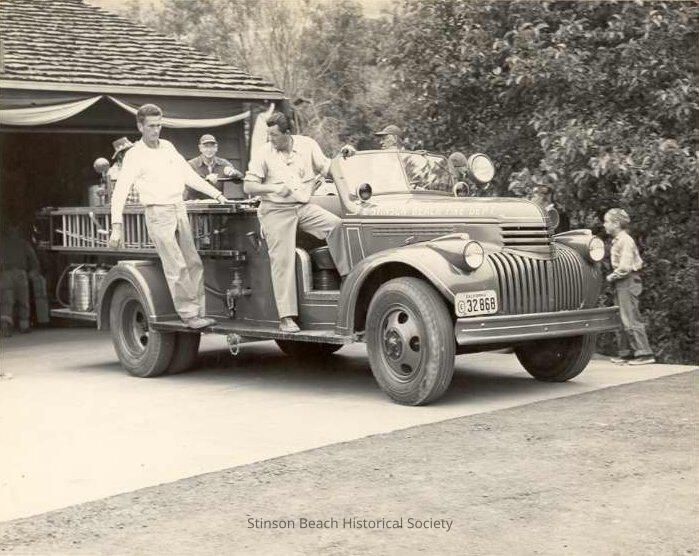 This original black and white photographic depicts an open cab fire truck with a ladder on the side and 5 men on it Two of the men are standing on the right running board, two are standing on the back, and one is on the left running board. The men are from left to right: unidentified (face obscured), Todd Steele, Will Airey, unidentified and Robinson Upton. There is a boy in front of the left wheel of the truck.Collection