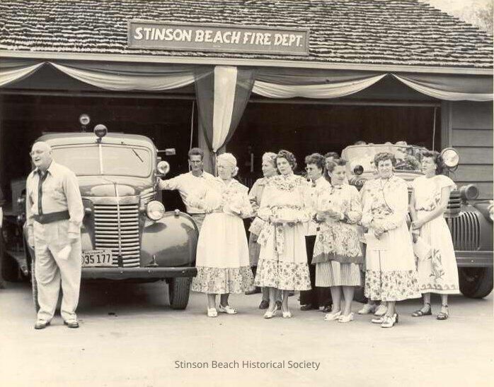Volunteer Fire Department, part of Stinson Beach Fire Protection District, Dedication of Fire House located on Highway 1 at Belvedere in Stinson Beach. Pictured are 8 individuals, L to R, Todd Bartlett, Todd Steel, Elsa Banson, Auda Bordanaro, unknown, Dorothy Cunningham, Yvonne Gilman, Mrs. DeCamp, unknown. The 4 ladies in front are wearing aprons over their floral dresses. Todd Bartlett stands apart, in front of the fire truck, looking left as if speaking.Collection