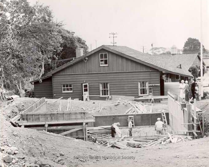 This original black and white photgraphic print depicts the foundation being laid for the church. There are three workmen surrounded by lumber in the sub street level at the lower center of the photo and three people (two women and a man) standing above, at street level, looking down into the hole, at the far right center of the photo. The building behind the church foundation, at the center of the photo, is the Community Center. Behind that, in the upper right hand portion of the photo, is the Firehouse.Collection