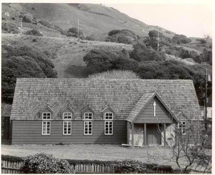 This original black and white photograph depicts the entrance and nave of the completed Community Church. The entrance has a peak roofed portico with a cross above the door. To the right of the entrance is an eight paned window. To the left of the entrance are four twelve paned windows. The windows' lower portions are in the wall of the church but the upper 4 panes are dormer style coming out from the roof of the church. In the background is a shrub covered hillside and in the extreme foreground can be seen the top of a fence and some bushes. The ground in front of the church is as yet unlandscaped.Collection