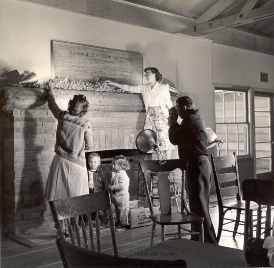 An original photograph by Jon Brenneis of three adults and two children standing in front of a large stone fireplace. The two women , one standing on a ladder, are placing greens on the mantle. A man with photographic equipment is taking a picture of them. Two small children, a boy on the left and a girl on the right are watching. A large plaque over the fireplace is inscribed "Stinson Beach Community Center, dedicated November 28, 1953. Conceived and constructed by the people of Stinson Beach". Four wooden chairs are scattered in the foreground.Collection