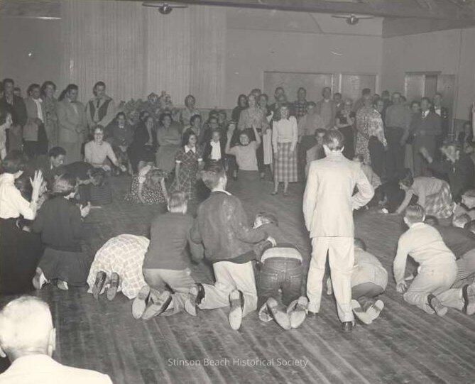 This original black and white photograph shows the hall full of people. There are upwards of 40 people standing or sitting against the back wall watching a circle of children (20 or more) on their hands and knees on the floor, playing some sort of game.Collection