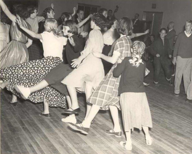 This original black and white photograph depicts a conga line with the last five people in the foreground, moving away from the camera and curving around to the left and then to the right so that the head of the line is in the background behind the people at the end. The very last person in the line is a girl with blond braids in a dark sweater and light skirt and wearing saddle shoes. Everyone ahead of her is kicking out with her left leg.Collection