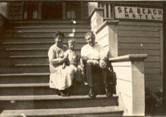 An older man (Jack Airey) and woman (Sarah Airey) with a small child (4 or 5 year old grandson, Robert) are sitting on the steps of the Sea Beach Hotel. The boy child is sitting on the woman's knee, who is holding him. She has short dark hair and wearing a white dress. The man has curly gray hair, wearing a white shirt and dark pants.Collection