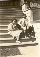 Two adults and a child sit on the stairs leading to the porch of the Sea Beach Hotel. A sign on the upper right shows part of its sign. A woman on the left has brown hair and wears a short sleeve print cotton dress, bobby socks and sport shoes. The child is blond, with light short sleeve shirt, and the man, also brunette wears a light long sleeve shirt and tie, slacks and high laced leather shoes. About thirteen steps lead up to the porch of the wooden structure.Collection