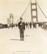A young boy (Robert Airey) stands on the Golden Gate Bridge facing the camera with a bridge tower in the background. He is wearing a dark shirt with pants and has a drink bottle in his right hand. People in the distance are small figures walking away from the camera, women with long dresses of the period (Depression) and hats. Coming towards the camera are small male figures also mostly wearing hats or capsCollection