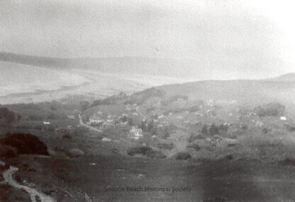 This black and white photograph is a somewhat blurry, low contrast panoramic view of Stinson Beach in the mid ground and Bolinas Bay, the sand spit and Bolinas Lagoon beyond the town. Bolinas Ridge is barely discernable in the upper portion of the picture. The foreground shows the hills and a portion of Panoramic Highway.Collection