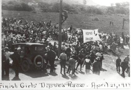 This black and white photograph shows a crowd of people around a cleared area. There is an old model car parked in the left foreground with a spare tire on the back. In the midst of the crowd is a banner facing the finish area with its back towards the camera. It reads DIPSEA INDIANS backwards. There is a telephone pole with a man scaling it in the center of the picture. One can barely make out two women, neck and neck, running into the finish area. Written across the bottom of the picture is "Finish Girls' Dipsea Race-April 21, 1918".Collection