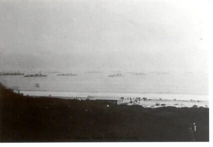 This black and white photograph looks down over a dark landscape to the beach and beyond. There are a number of people on the beach and at least eleven craft visible (the ones farther out are obscured by fog) in the ocean just off Stinson Beach. They are headed North, apparently leaving San Francisco Bay.Collection