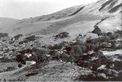 Panoramic view of a hillside rising from downtown Stinson Beach. From the lower left a road leads up to a small light colored house. All other structures seem to be to the left of this line, mostly along a wooded creek, at least six quite significant, others more like sheds. The hill above the built up area is completely bare except for growth following the creek line.Collection