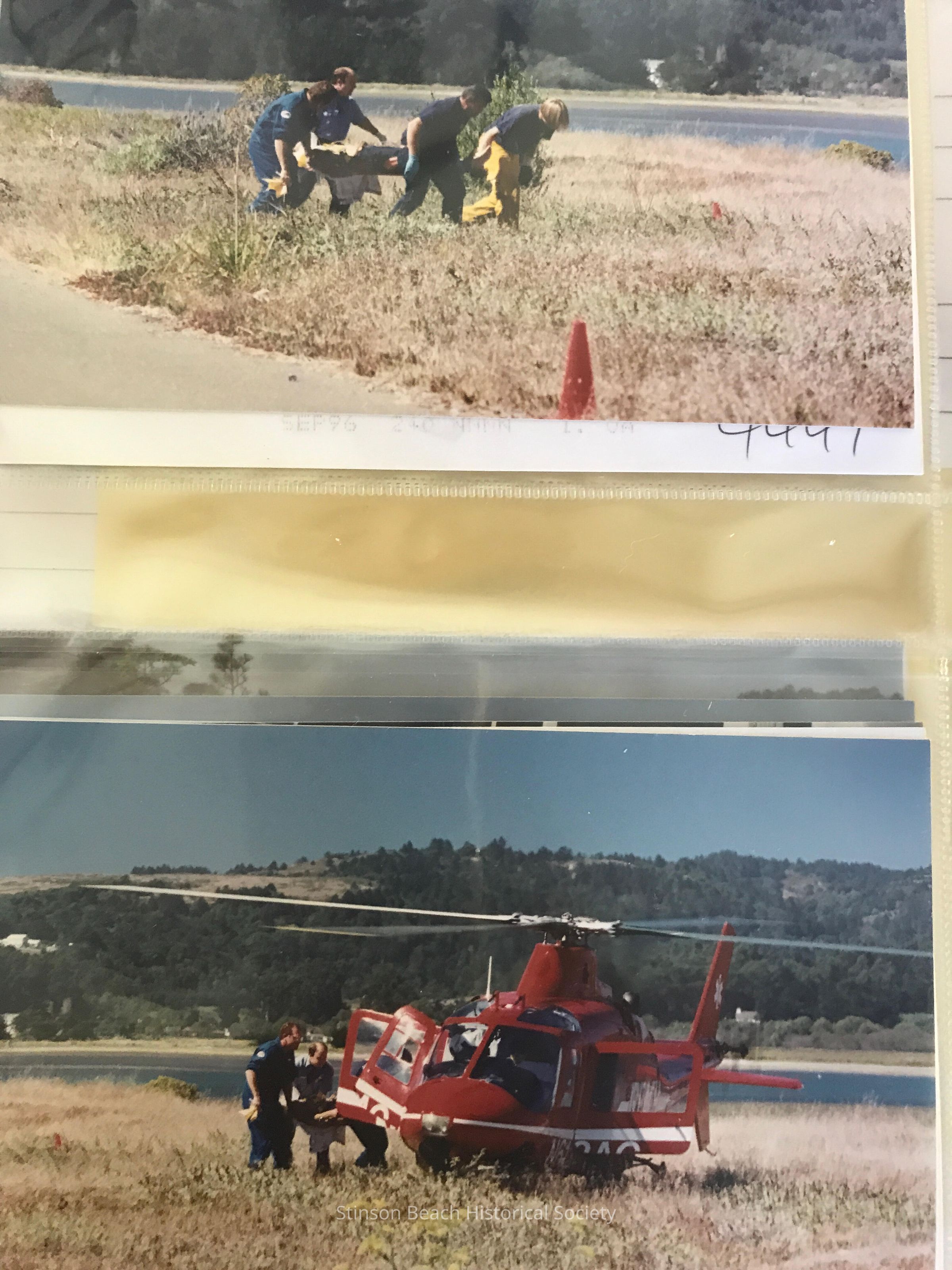 This album contains photos of several rescues including roof rescue on Dipsea with 1st use of helicopter, boat rescue 1995, cliff rescue 1999, cabin fire exercise, Elwood flood 1978.