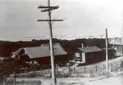 This rather dark black and white photograph shows a utility pole in the center foreground with a dark house directly behind it. To the right of that house and uphill from it is a smaller house, also dark and with white trim around a window and the door. It has little front deck with stairs leading up to it. To the right of it is a partial view of another house, shigled and lighter in tone. Below and beyond the houses are trees and the shoreline with waves. The day is overcast and the horizon is barely discernable. The houses are unidentified but are located above Airey's store (see#1993-605). The road in the foreground is Calle Del Mar.Collection