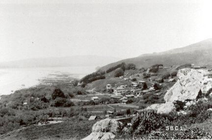 This black and white photograph is a panoramic view of the town of Stinson Beach. In the right foreground are some large boulders beyond which are houses on the hillside above Bolinas Bay. Beyond the coastal hills can be seen the sand spit extending towards the dimly seen Bolinas Ridge. The latter is extremely hazy. A row of white tents can be seen in the left middle ground at the beginning of the sand spit.Collection