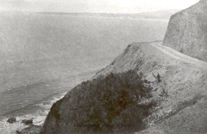 With the shoreline showing a great expanse of ocean with rocks below the cliff on the lower left side of the photograph, a highway is cut into the cliff and turns a corner at the upper right of the picture. In the distance another shoreline extends to close in a bay. The highway is at this point just a narrow dirt road.Acquisition