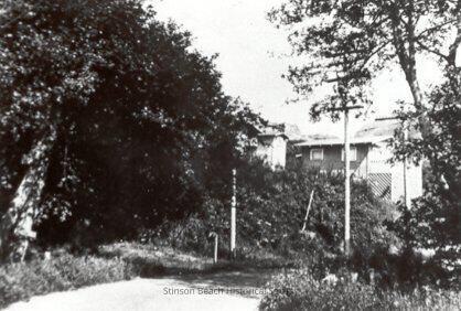 A lane bordered by flowers leads through trees and large shrubs towards partially visible houses on the hill. The nearest house towards the center of the photograph is shingled and has two large windows under the overhanging roof. One of the trees appears to be a birch, and some of the flowers, iris. Two utility poles are along the lane on the right side.Collection