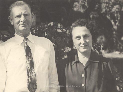 This black and white original photograph is of a man and a woman facing the camera from the chest up. The man is wearing a white shirt and a dark tie printed with kind of zigzags. He is squinting at the camera somewhat. His hair appears to be light brown or dark blond. The woman beside him is wearing a dark blouse. Her hair is dark. She is smiling slightly. There are trees and shrubbery behind them. The man is Will Airey and the woman is Louise Airey.Collection