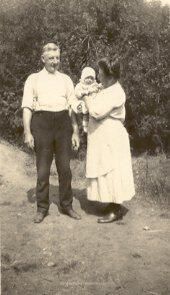 This black and white, original photograph shows a man and woman in full length. The woman is holding a baby in a baby suit with a hood. She is to the right of the man, facing him but looking at the baby. Her dark hair is in a bun and she is wearing a light, long sleeved, ankle length dress and an apron. The man is wearing dark pants and a light shirt with the sleeves rolled up to the elbows. His hair is grey or blond. He stands with his hands to his sides and looks at the baby also. They are Jack and Sarah Airey with their grandson Robert. On the back of the photograph is hand written 'Grandma Airey' and 'Grandpa Airey'.Collection