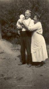 This black and white original photograph is very similar to that of #1993-618 except the man is holding the baby. He is holding the baby on his right side and both the man and the woman are turned slightly to their right, looking at the baby. This picture is also inscribed on the back with 'Grandma Airey' and 'Grandpa Airey'.Collection