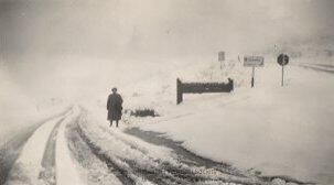 This black and white photograph shows the figure of a woman (Louise Airey) standing on a snowy road where tire tracks are visible. To the right of the figure is a snow covered hill with four signs, one a wooden fence type sign, two rectangular signs and one octagonal (stop) sign. One of the rectangular signs has discernable letters. It reads Stinson Beach with an arrow pointing straight ahead and Mt. Tamalpais with an arrow pointing right. The picture was taken at Pan Toll at the junction of these two roads. On the back is written 'Febr. 28, 1951 at "Pan Toll" 4 miles from Stinson Beach Calif'.Collection
