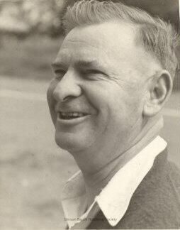 Half profile portrait of a smiling man (Will Airey) with an open shirt collar showing above his sweater. He has short light hair, no sideburns, smile wrinkles around his mouth and eyes. This seems to be a detail of a larger photograph taken outdoors.Collection