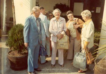 This color photograph shows four people lined up in front of a building. There are potted plants on either side of the people. The man on the left (Lester Sadler) is in a light blue suit. He is holding two small bags in his left hand and is facing right. Next is a woman (Louise Airey) with grey hair and in a light pink pant suit. She has small cream colored tote bag over her left arm. Next to her is a woman (Dorothy Mayfield) with short dark hair and glasses wearing beige slacks and a white shirt with an apricot shirt-jacket over it. She has a dark bag over her left shoulder. Lastly on the extreme right is a woman (Mildred Sadler) facing left. She has grey hair and is wearing a white pants suit over a yellow blouse. She is holding a tan handbag and a silver tote bag in her left hand. There are some unidentified people behind the group. On the back of the photo Louise Airey has written 'left to right Lester Louise Dorothy Mildred I look like Ruth here. We are all wearing our Whistle Stop pins - on our trip to Hawaii'Collection