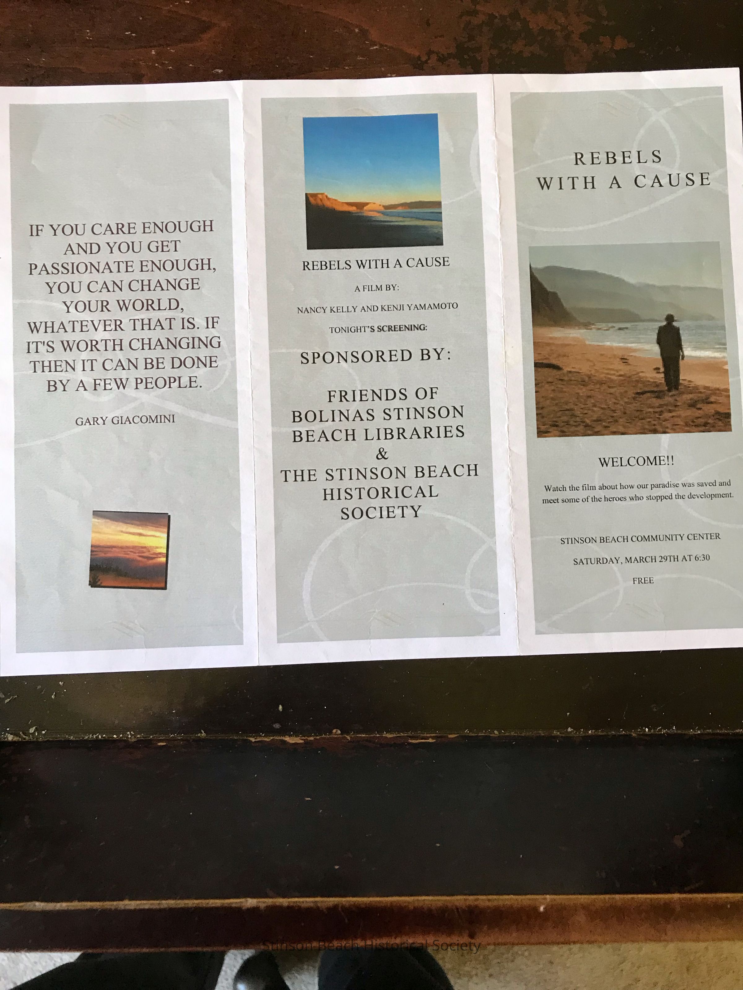In 2014, Friends of Bolinas Stinson Beach Libraries & SBHS hosted the screening of "Rebels With A Cause", a documentary by Nancy Kelly & Kenji Yamamoto, narrated by Frances McDormand. It is the story of a regional California effort that grew into 14 National Seashores. It was the result of garden clubs, ranchers, farmers, conservationists, politicians from both parties, widows and volunteers working together.