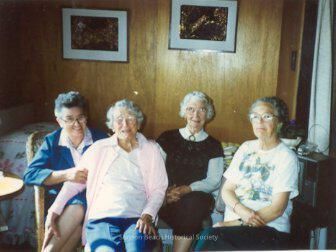 This color photograph is of four ladies seated facing the camera. On the left is a woman (Dorothy Mayfield) with dark hair, wearing a blue suit. She has her hand on the arm of the woman next to her (Louise Airey) who has grey hair and is wearing blue jeans, a white shirt and a pink sweater. To her left is a woman (Mildred Sadler) with white hair, wearing black mid calf length pants and a black short sleeved sweater over a white blouse. Next to her on the far right is a woman (Anne Leary) with grey hair in braids wound around the back of her head. She is wearing a white T shirt with a bluish design on the front. All the ladies are wearing glasses. There is a wood panelling wall behind them with two photographs hanging on it.Collection
