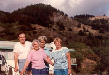 Louise Airey is standing with 3 other people - one woman on her left who she is holding at her waist, and a man and woman on either side and slightly behind her. They are outdoors, possibly on porch stairs as she and the man behind her are holding onto a railing. Part of a white house with blue trim is in the background. Beyond the house is a hillside knoll partially covered with trees and brush. The sky is cloudy.Collection