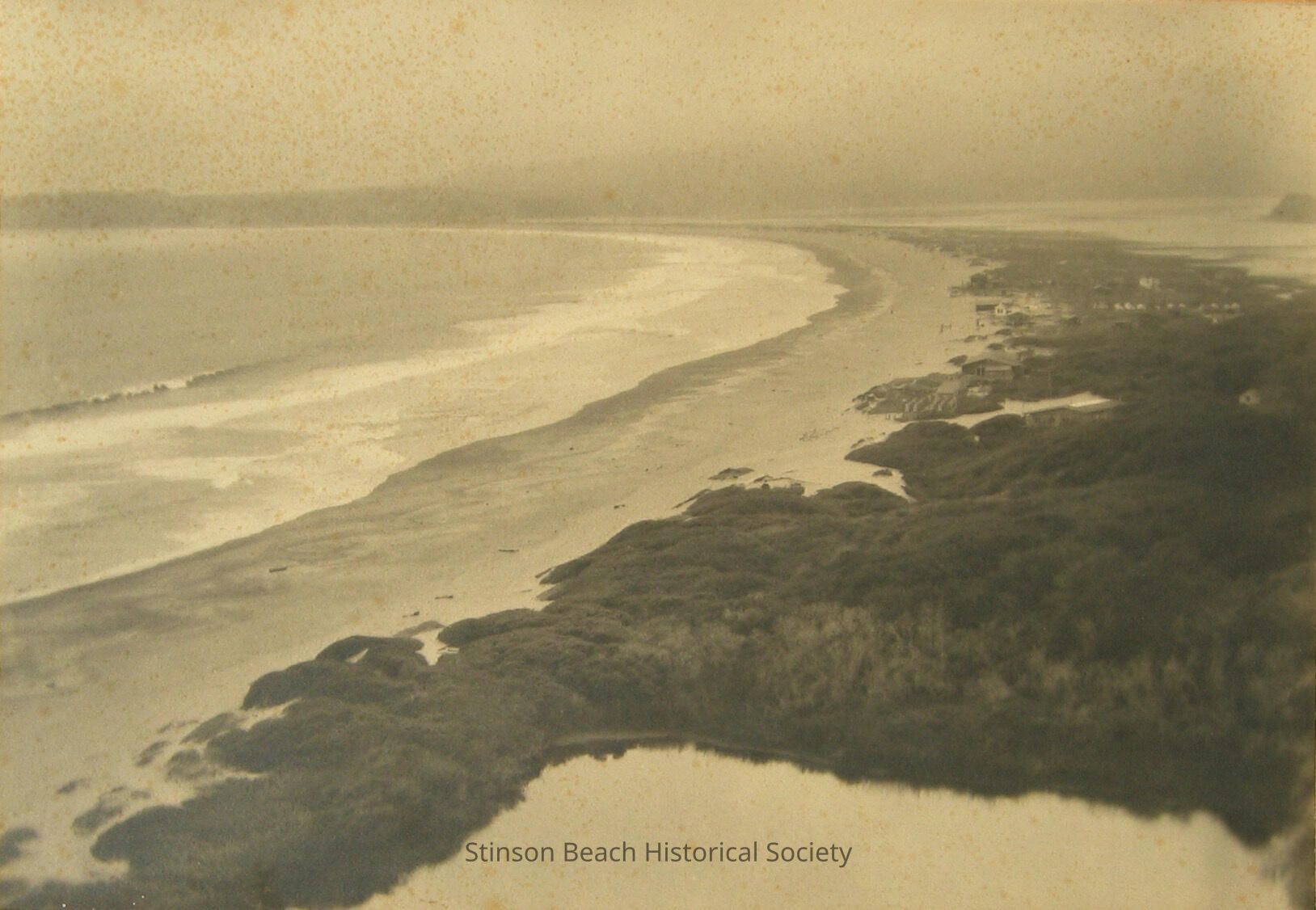 A photographic print of Stinson Beach taken from the hills above Highway one looking down on the beach and the lagoon. Attached note (1993-525-02) describes, "Stinson Beach 1931. Lagoon - field and part of State Park parking lot." In this photo the parking lot is still a lake. The note also names the buildings and development shown on the photo (in order of roughly from the foreground to back): Sea Downs Resort (Kent), Dipsea Lodge (Stinson) Fitzhenry operated by the Sadler family, Stewart-Veal Cottage (was at the ocean front of Calle del Pradero), Schoefield, Harlon, McCarthy, Wilson, Henky-Frenchy + Bus driver, stage between Stinson and Sausalito, Upton Camp (far right tents), Pixley (tall, ocean front), Sellmer (tall light one in back?)Collection
