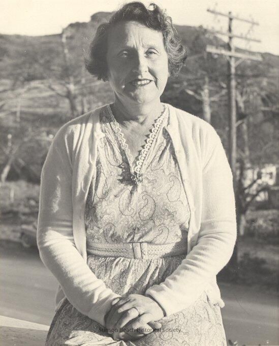 This black and white photograph shows a woman (Louise Airey) seated facing the camera. She is shown from the lap up. She has short dark, somewhat greying hair and is wearing a light colored, paisley print dress with a vee neck lined with eyelet piping and a woven belt, and a white cardigan sweater. Her hands are folded in her lap and she is smiling at the camera. A hill and a telephone pole are in the background.Collection