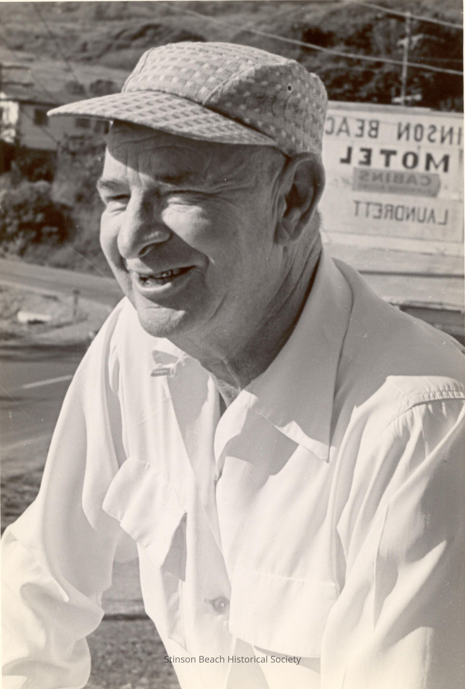 See 1993-621Q-02 A smiling elderly man (Will Airey) in white shirt and checkered billed cap looks off to the left while sitting in front of a SB Motel sign.Collection