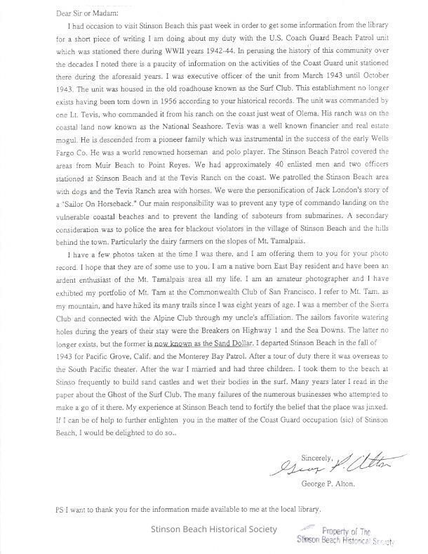 Letter from George P. Alton, the donor of series of photos of US Coast Guard Beach Patrol, Dog and Horse Patrol stationed in Stinson Beach during WWII years 1942-44. It describes their lifestyle, training, activities on the beach evidenced by the photos. See photographs, 2002-265 to 271.Collection