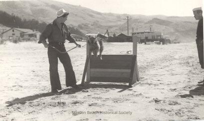 2002-265 to 271 shows training dogs on the beach of Stinson for patrol purposes. The first 6 photos are of the dogs while 271 shows 7 patrol horses led by 3 Coast Guard men, probably at Tevis Ranch, presently National Seashore headquarters barn. See 2002-265A for the accompanying letter describing the WWII event in 1942-1944 when the US Coast Guard Patrol patrolled Muir Beach to Point Reyes with dogs and horses. The Unit was housed at the Surf Club building, presently the location of Stinson Beach County Water District building.Collection