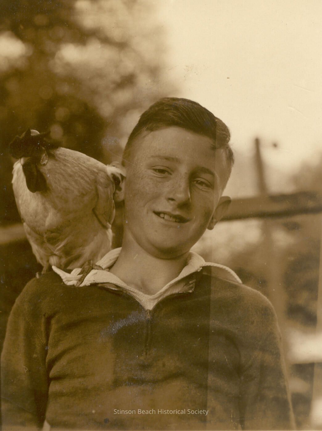 Sepia colored photograph of young boy (Airey, Robert) outdoors with a large white hen perched on his left shoulder. The boy's head is tilted to one side to lean away from the fowl. He has a half smile on his face. He is wearing a wide colored shirt and a jersey over it. Writing on the back of the photo says "Robert Airey - pet hen probably 1934 or so"Collection