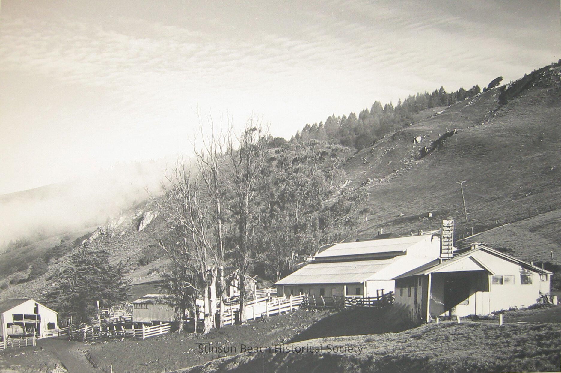 A large photographic print of the White Gate Ranch as it stood before GGNRA (established in 1972) took over in late 1970's. Looking uphill, it shows the ranch land surrounding the group of 5 buildings. Part of the Bolinas ridge (shown in the background on the left) rises in fog. This is a companion photo to 1993-774P-01 which looks toward the beach.Collection