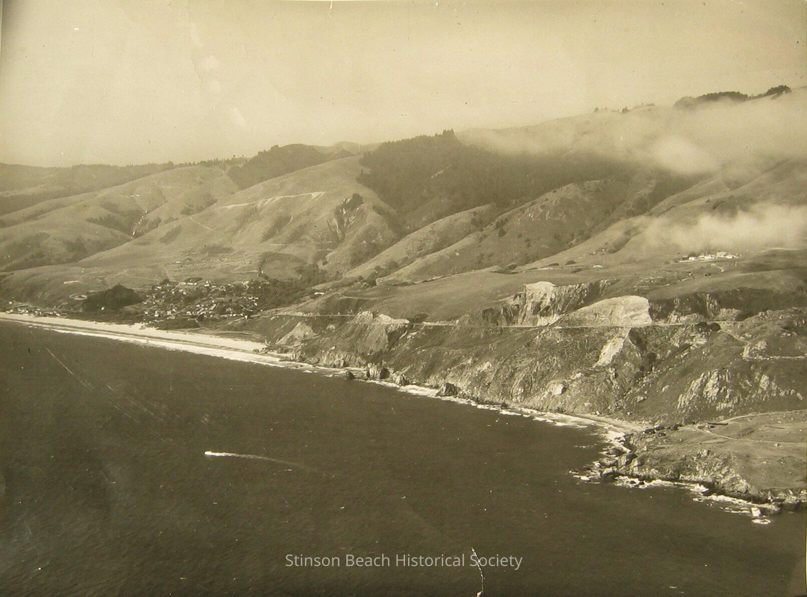 An aerial photograph in black and white. A photograph of the Stinson Beach coastline to the cottages at the Steep Ravine and the hills behind taken from air. Shows the town of Stinson Beach, Stinson Beach, Highway 1 and the rocky shore below, the cottages at Steep Ravine in the lower right. The Pacific in front, light fog rests on the hills. On the back of the photo stamped: Fred Mae Aero Photos. For Additional Copies of this Photo Refer to Neg. No. 11.Collection