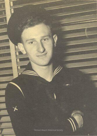 A young man, Robert Airey, in his US Navy sailor's uniform, wearing his hat on the back of his head. He is photographed in a closeup shot with just his upper body showing. The background is a venetian blind made of wooden slats with cotton straps. The uniform seems to be the usual navy blue with a middy blouse top. He has 2 stripes on the cuff showing on his left arm, and a white stripe on the shoulder. He wears a heavy ID-type bracelet on the visible hand, and above it, near the collar is a small military ribbon.Collection
