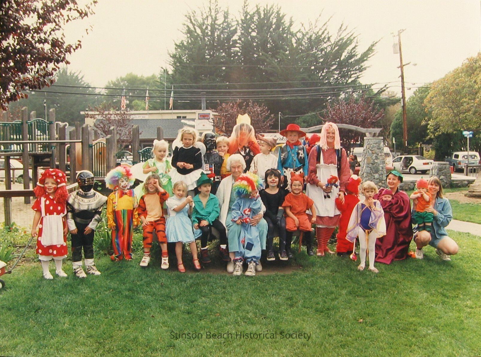 A large color photo print of Stinson Beach preschoolers, with a few parents, and Mrs. Mildred Sadler at the center. It was taken at the Village Green I where 19 preschoolers and 4 parents are all dressed in Halloween Costumes. Trees in the park, part of Parkside Cafe and Village Green playground can be seen in the background.Collection