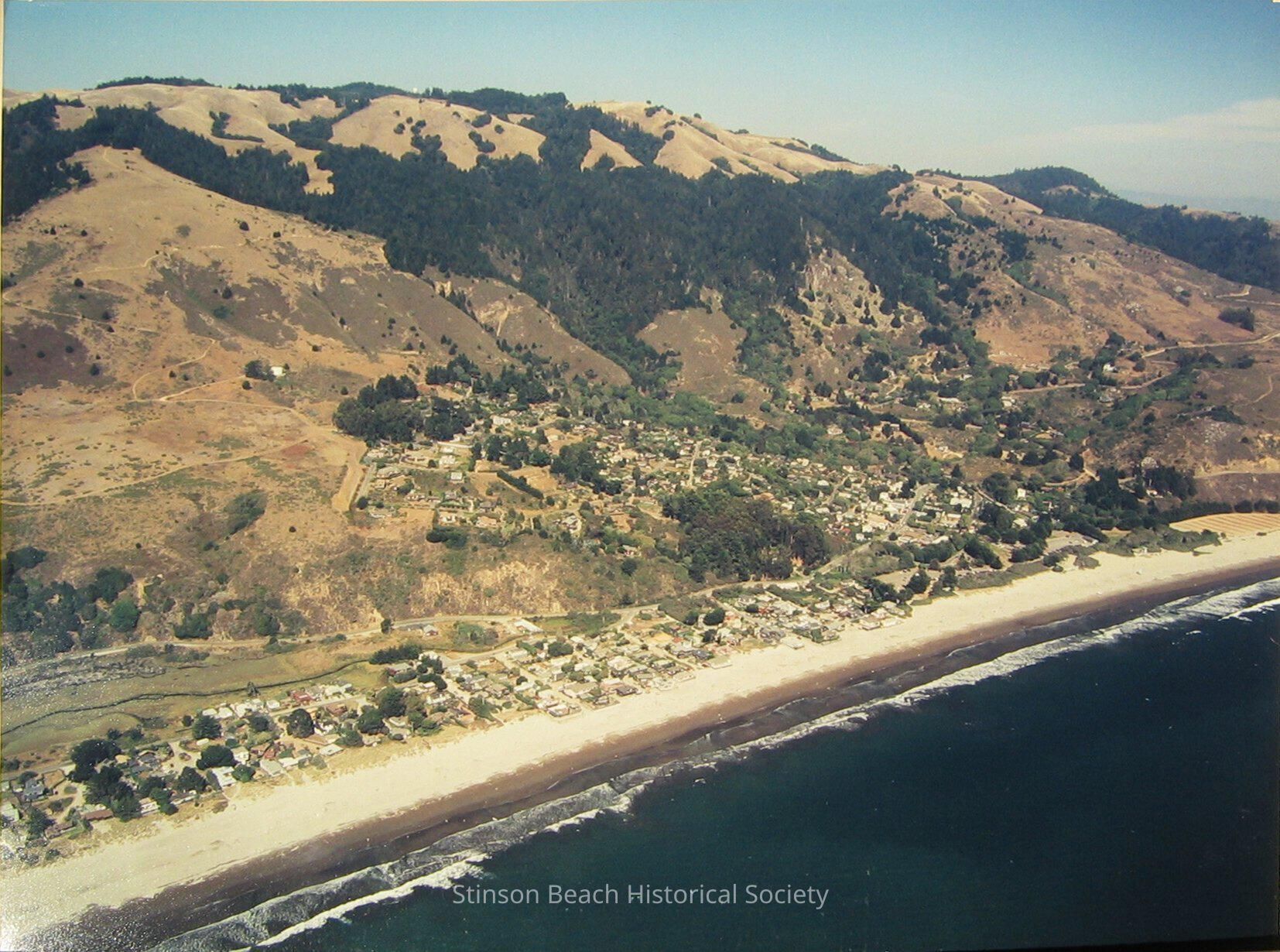 Aerial photograph of Stinson Beach development and the hills above. Includes houses on Panoramic Highway to right and houses on Rafael Patio at lower left. Shows surf line in front. On the back of photo a sticker printed: Air Photo, Inc. Copyrights Resv. 1997 (425) 774-5360 27BOLNI - 100 Bolinas, CaCollection