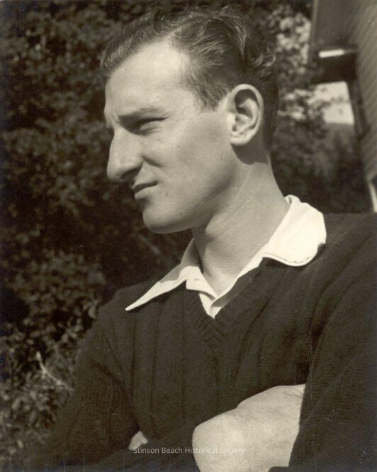 This black and white photograph is of a young man (Robert Airey) close up from the chest up with his head turned to the right in profile. His arms are crossed with his hands tucked under his armpits . He is wearing a dark V neck sweater with a white, or light shirt underneath. He is squinting slightly. His hair is dark and wavy.Collection
