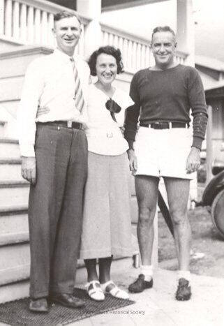 Left to Right: Will and Louise Airey standing with an unidentified male in front of the steps of the Sea Beach Hotel. They are all looking at the camera and smiling. Will in slacks, white shirt and striped tie, Louise in white belted blouse with a dark bow in the V of the neckline and a pale skirt that comes just below the knee. The other male is dressed casually in shorts and long-sleeved t-shirt and looks tanned and athletic. Will and Louise, side by side, each have an arm around each other; the other male stands feet slightly apart with hands at sideCollection