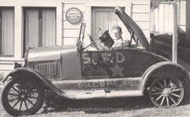 Robert Airey sits in a circa 1915 car with a large German shepard in front of the Sea Beach Hotel. The top of the car is halfway down and the sides read in large painted letters S.B.F.D. and Pol. Dept. in smaller etched letters next to a painted star. Along the bottom is painted "Welcome, Babe." A circular sign on the wall of the building reads: Meeting Hall Progressive Club of Stinson Beach. This photo is printed on postcard paper and the back shows that it was mailed from San Francisco on Jan. 20, 1955. It is addressed to Mrs. Robert Airey and just says "Welcome, Babe"Collection