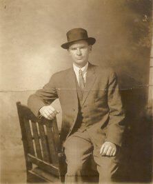 A serious young man (Will Airey) dressed in a business suit with a vest, a narrow tie, and a felt hat, is sitting on the arm of a wooden chair supporting himself by his right hand on the back of the chair. To his right on the wall there appears to be the reflection of a flash camera, as in a photographer's studio. The photograph has been made into postcard.Collection