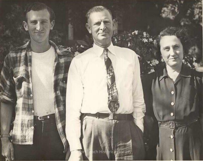 An enlargement of a photograph of the Will Airey family, taken outdoors against a flowering hedge. From left to right are son Robert, Will Airey, and Louise Airey. Robert wears a T shirt and slacks with a plaid open shirt. His father is more formally dressed in white shirt and tie and Mrs. Airey wears a button down the front dark colored dress with an open shirtcollar neckline. Will Airey's hair, in the sun, appears lighter than his son's or wife's.Collection