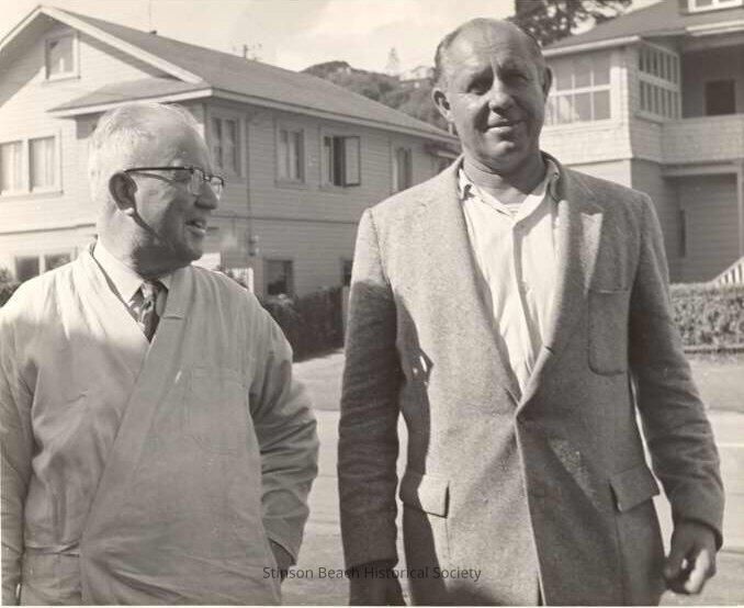 Two elderly to middle-aged men stand side by side on Highway One in SB with the "Shore Store" bungalow and "Al's Alleged Antiques" building behind them. The man on the left, James Mayers, is looking at the other man who is facing the camera. Mr. Mayers has thinning white hair, and is wearing glasses and a smock-type apron tied over a white shirt and tie. The other man is also balding and wearing white shirt, open at the neck, and tweedy jacket. He has a slight smile on his face.Collection