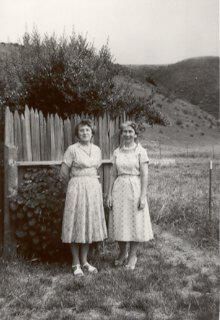 This black and white photograph shows two women in short sleeved dresses standing in front of a grape stake fence with a tree, grassland and hills in the background. The woman on the left is Louise Airey, the one on the right Mildred Sadler. NOV 1959 is printed on the top margin of the photo.Collection
