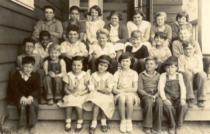This is a black and white photograph of 22 children sitting in 3 rows on the steps of the schoolhouse (see 1993-638-01). The children are unidentified. Back row very left is Jose Silva who lived at the White Gate Ranch and later moved to Bolinas and became its Fire Chief. The second from the left is Greg Sherfey.Collection