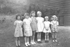 Six school girls stand in a row, side by side, in an open space outside of a building of which only the wooden side is visible. They are all wearing dresses and smiling. Of the 6 girls, only 2 are identified: Barbara Smith (4th from left) and Diane Smith (5th from left).Collection