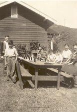 Eight boys of varying ages stand around a work table outside the schoolhouse. One girl is in the extreme background. Twelve figures, appearing to be about 10" high, made possibly of clay, are on the table. A portion of the porch shows around the corner. On its top is the word "school." A camera case is resting on the end of the table nearest the photographer. It is a day with bright sunshine judging by the sharp shadow under the eves of the building.Collection