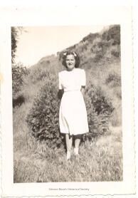 An evergreen shrub and a hillside is the backdrop for a young woman (girl) in a shortsleeved summer dress. She has shoulder-length dark hair, parted in the middle and held back by two ribbons.Collection